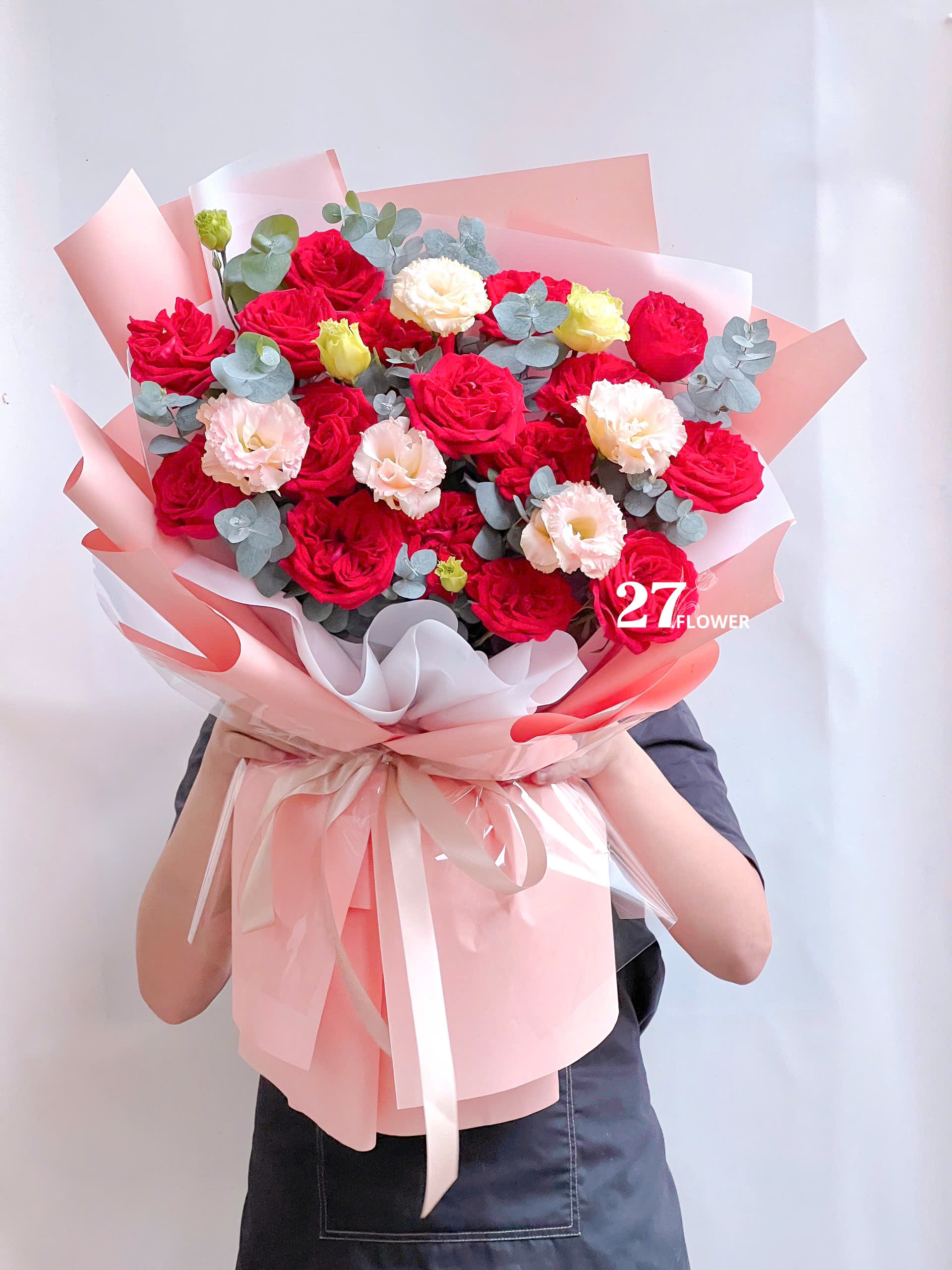 Sản phẩm được bó thủ công bằng tay,hoa theo mùa, độ nở,dáng hoa,hoa thay thế, thành phẩm sẽ đạt 70% so với mẫu.